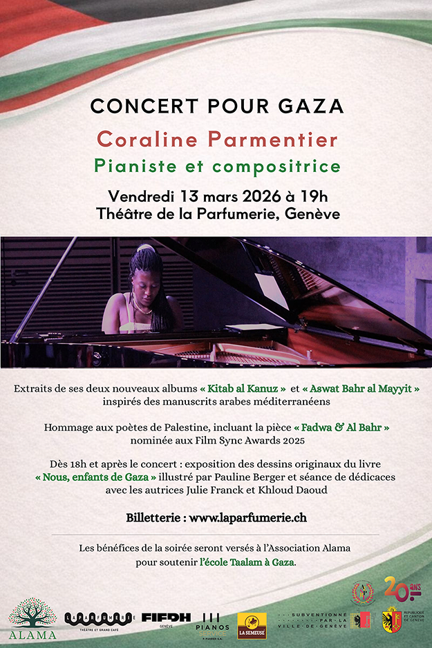 Rejoignez-nous pour un voyage musical exceptionnel entre Orient et Occident avec la pianiste-compositrice Coraline Parmentier, lauréate du Prix du Public Pour la Paix 2017 et Ambassadrice de Waves of Freedom Switzerland. Ce concert au profit de l’école Taalam à Gaza soutenue par l’association Alama propose une expérience mêlant piano occidental et oriental, projections visuelles et créations sonores inédites. Au programme : des extraits de l’album Kitab al Kanuz inspiré des manuscrits arabes méditerranéens, et le vernissage de l’EP Palestinian Voices, hommage aux poètes de Palestine incluant la pièce Fadwa & Al Bahr nominée aux Film Sync Awards 2025. Une soirée solidaire où la musique devient vecteur d’espoir et de soutien.