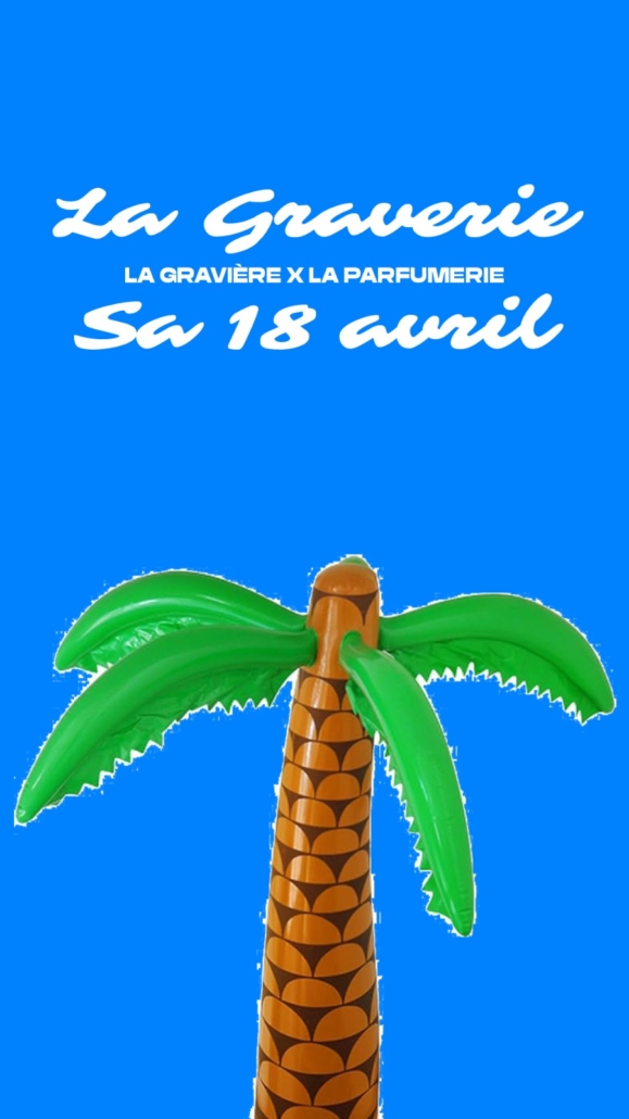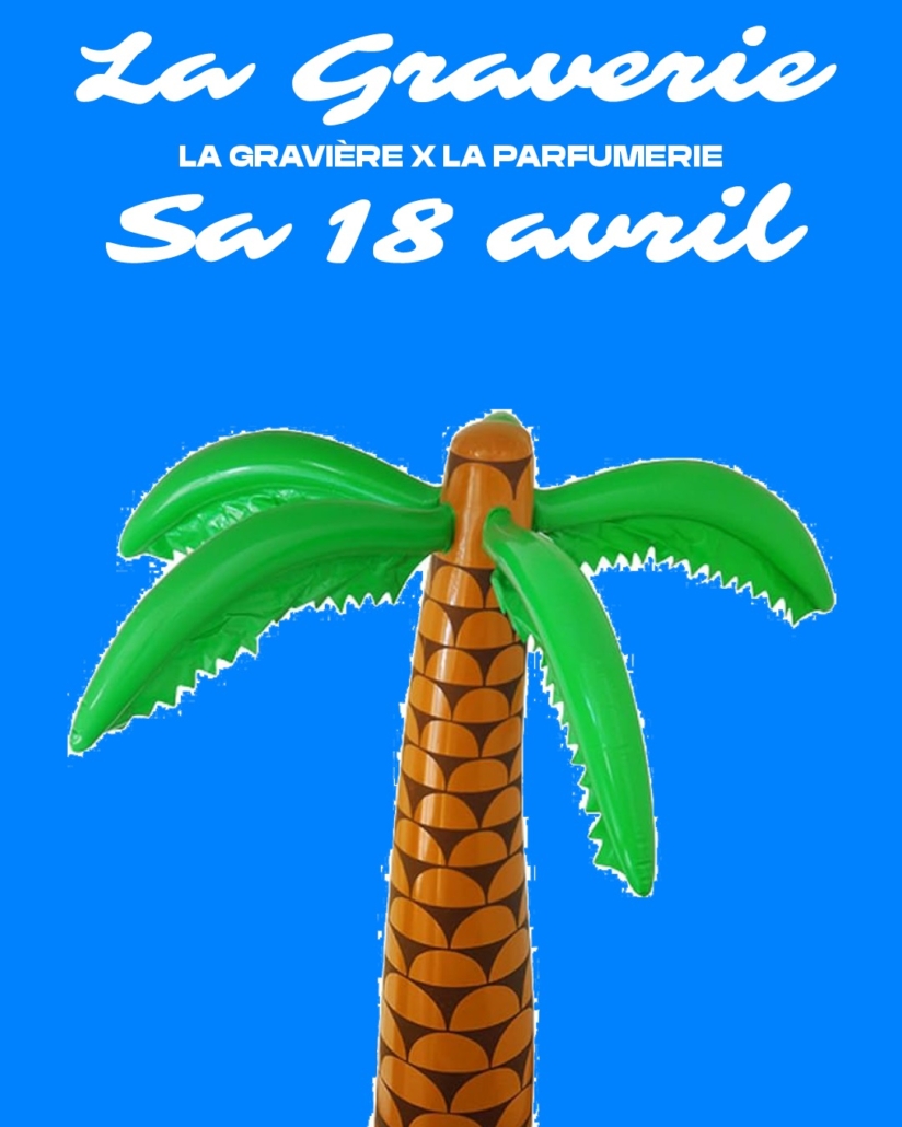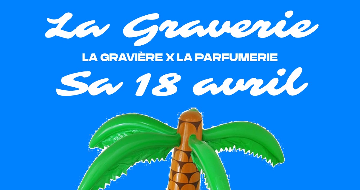 La Graverie est de retour en avril ! Samedi 18, on s’associe une nouvelle fois avec les voisin.e.x.s de La Parfumerie pour une Graverie pré-estivale pleine de chaleur, d’éclosion de bourgeons et de cui-cui de tes oiseaux pref. La formule tu la connais : 3 dancefloors et un immense espace en extérieur plein de surprises 🏝️☀️