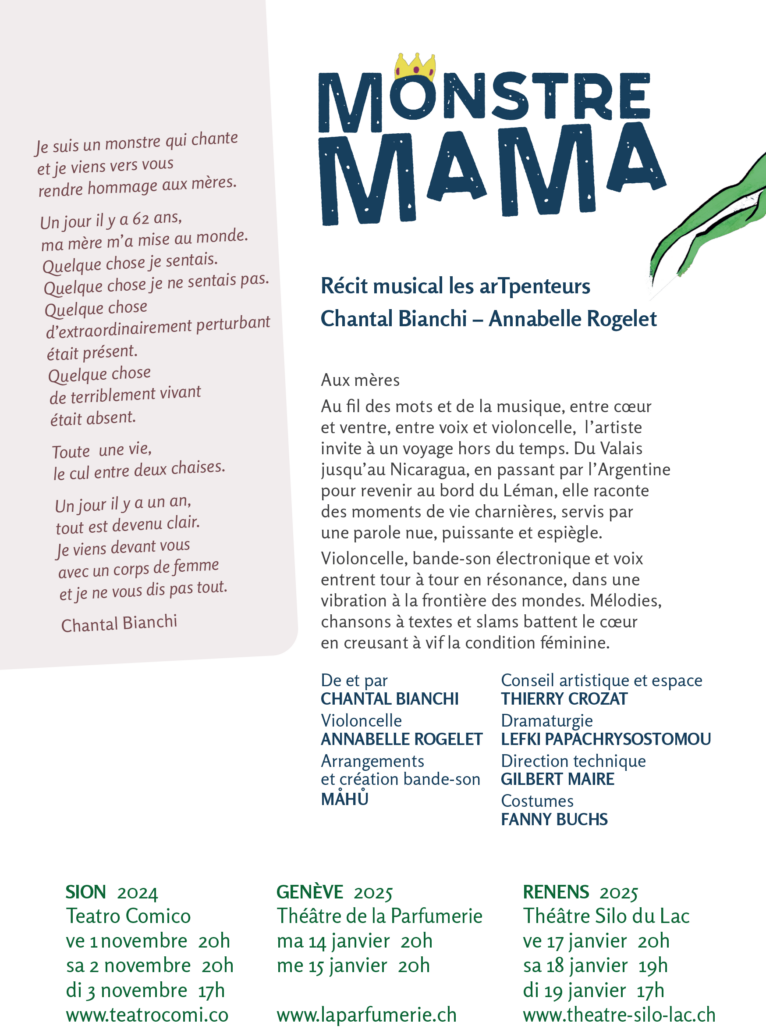 Au fil des mots et de la musique, entre coeur et ventre, entre voix et violon-celle, l’artiste invite à un voyage hors du temps.